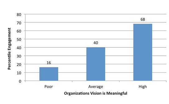 Based on the graph, employees who do not have a clear understanding of the company’s vision scored 16% on the engagement scale. It’s likely they are only showing up for the paycheck – and nothing more. However, those employees who embraced the vision scored a 68% on the engagement scale. These team members are more highly invested in meeting the company’s goals.